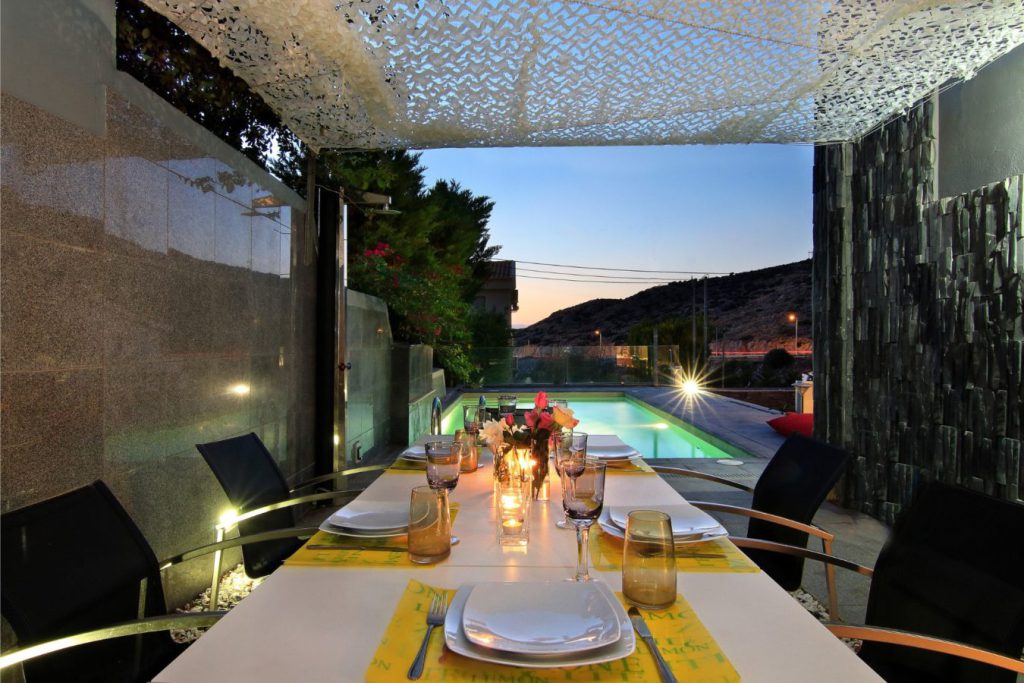 Στο σαλόνι υπάρχουν μεγάλα παράθυρα που οδηγούν απευθείας στην πισίνα δημιουργώντας μια ευάερη αίσθηση. Οι παστέλ αποχρώσεις έχουν επιλεγεί για τους τοίχους ώστε να ταιριάζουν διακριτικά με τον μαύρο δερμάτινο καναπέ, ενώ διακοσμητικά αντικείμενα και έπιπλα προσθέτουν παιχνιδιάρικα πολύχρωμες φωτεινές αποχρώσεις. Τα μοντέρνα έπιπλα μαζί με το μαύρο σαλόνι και το φωτισμό ακτινοβολούν μια εκλεπτυσμένη μοντέρνα ατμόσφαιρα. Τα μεγάλα παράθυρα που οδηγούν απευθείας στην πισίνα δημιουργούν μια ευάερη αίσθηση στο σαλόνι, ενώ η παρακείμενη τραπεζαρία και η πλήρως εξοπλισμένη κουζίνα είναι ιδανικά για τους επισκέπτες που απολαμβάνουν συγκεντρώσεις και προετοιμάζουν δείπνο μαζί.
